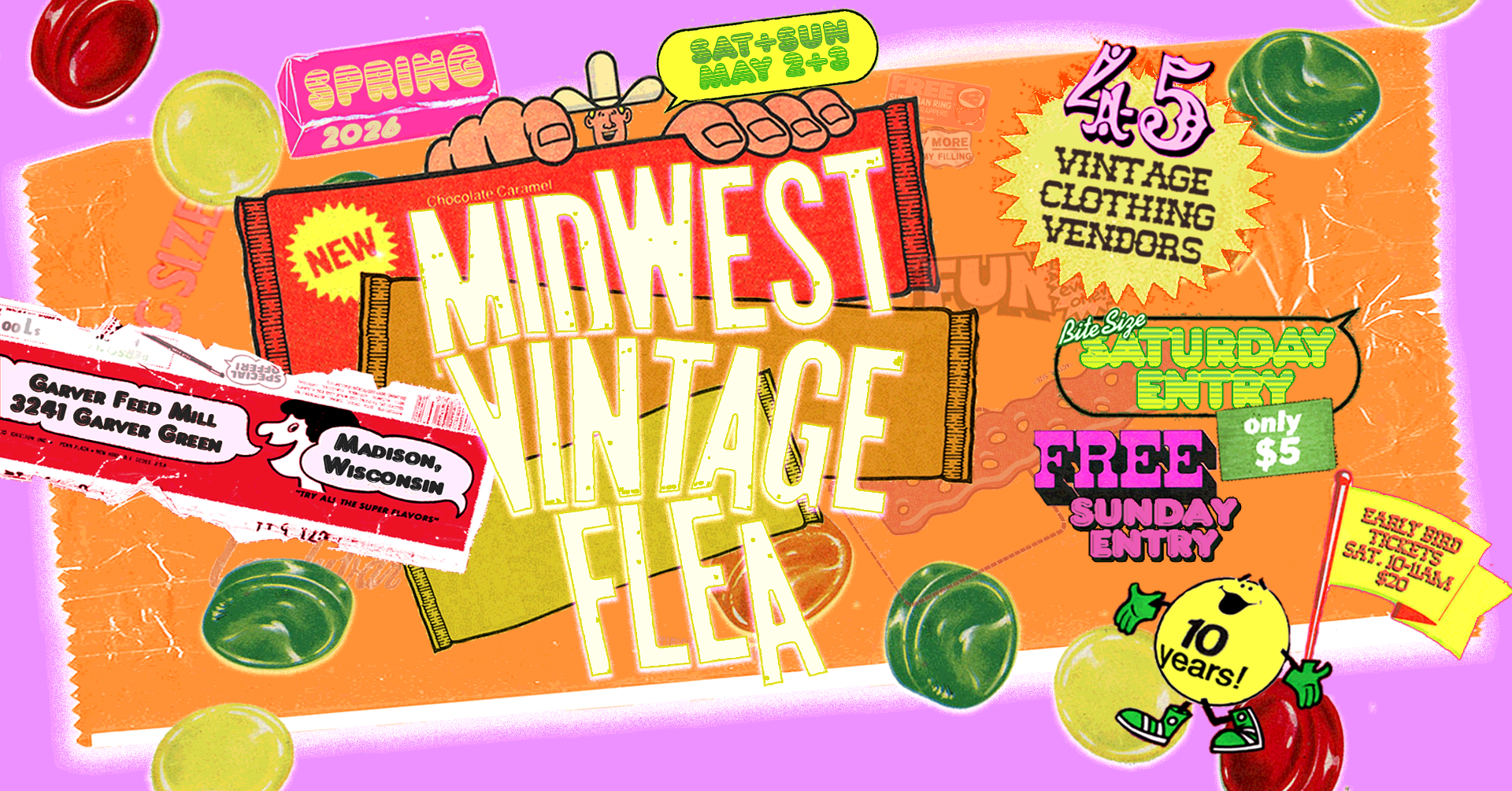 Selling vintage means different things to different people — for some, it’s a new obsession; for others, it’s a lifelong calling. For ten years, Midwest Vintage Flea has brought that world together in Madison — and Spring 2026 continues that tradition with a fresh, “candy”-coated perspective.
